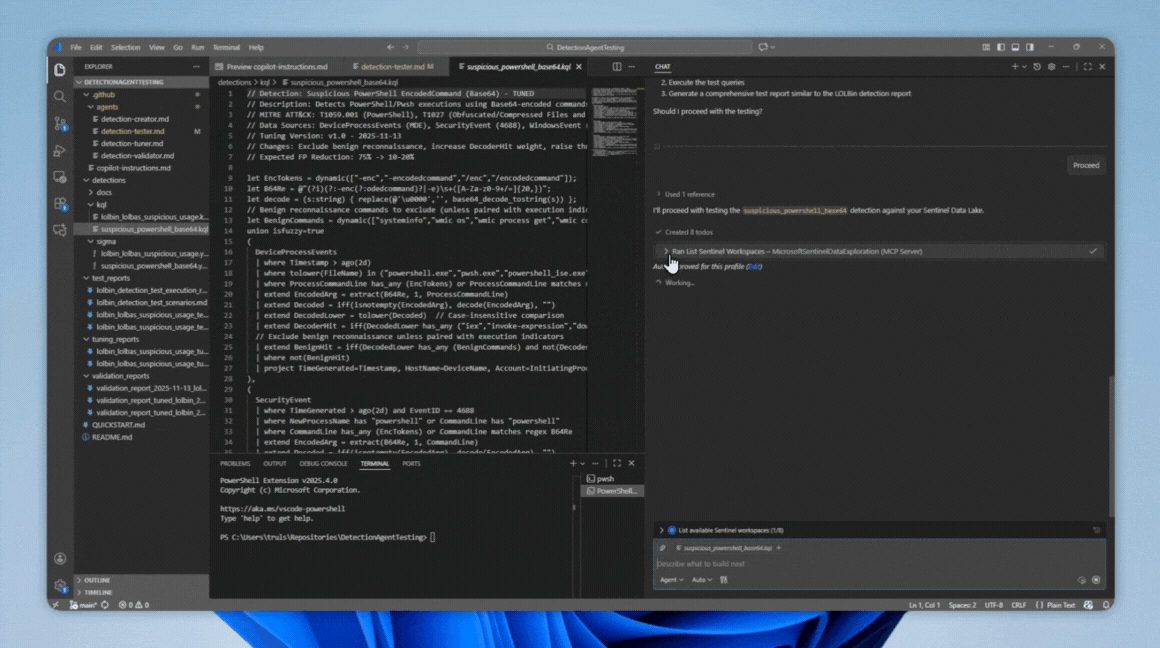 It’s a bit messy, but it follows the same idea we had originally - we can provide a template that Copilot will help us change based on our input, it will validate it against best practices and then test it against live historical data in the data lake via MCP.