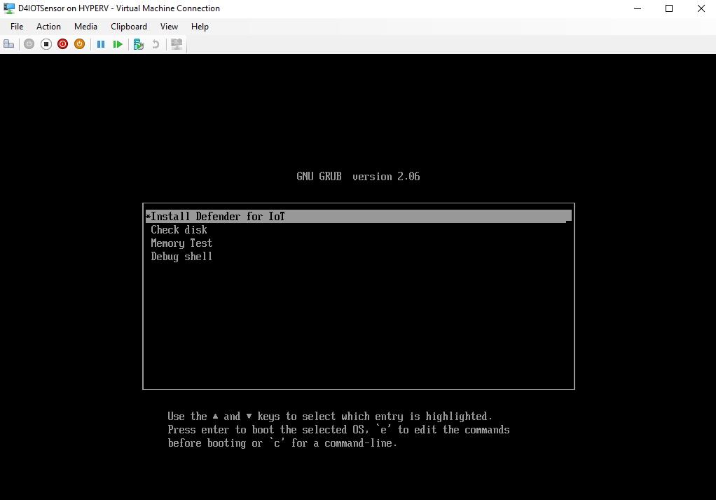 Basically installing D4IOT is just adding a DVD-drive, making sure it’s first in the boot order and mounting the Defender for IoT ISO. That should send you to the correct boot menu. It has changed a few times over the years, but this is the current Hyper-V appliance boot menu: